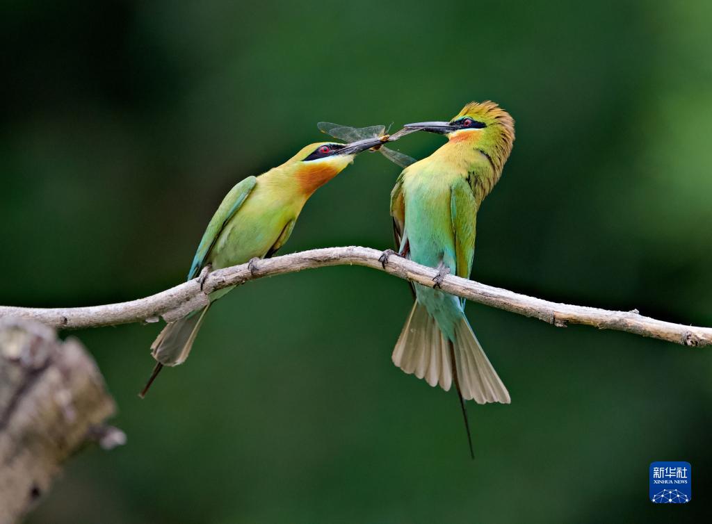5月20日,雄鳥(右)在給雌鳥喂飼昆蟲。