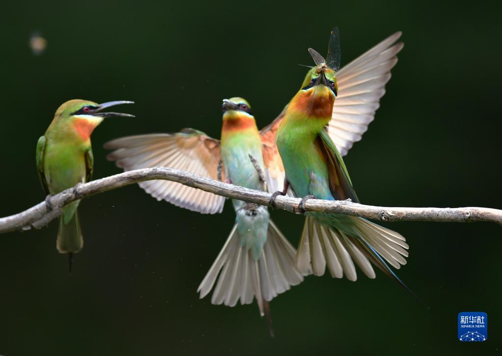 5月20日,兩只栗喉蜂虎在等待雄鳥(右)喂飼昆蟲。