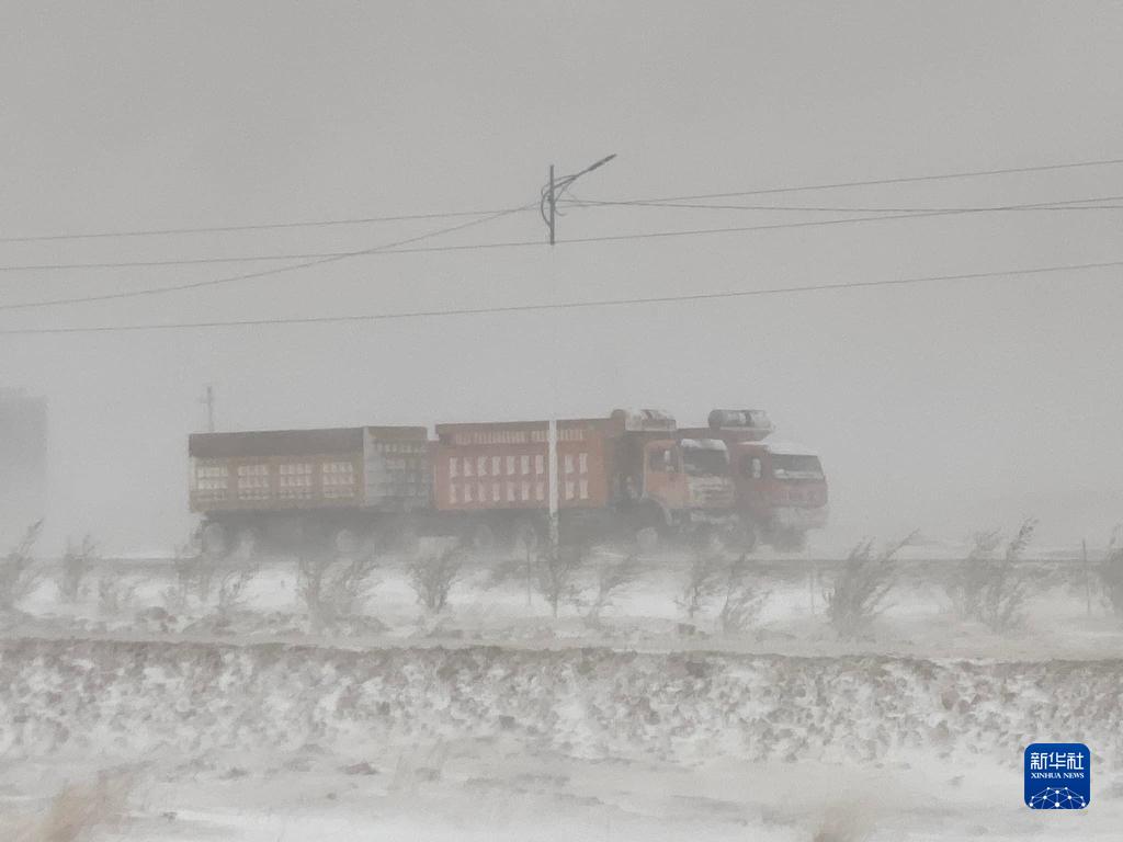 5月20日,在蒙古國蘇赫巴托爾省,貨車在暴風雪中行駛。