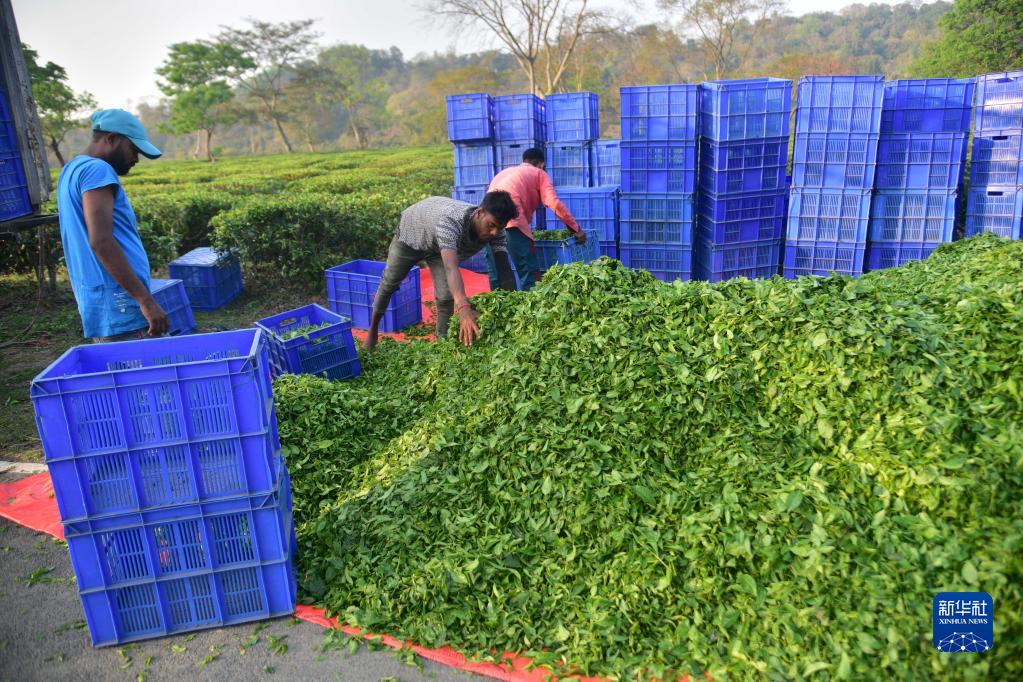 這是2023年3月14日,工人在印度阿薩姆邦納加奧恩地區的茶園里將茶葉裝箱。