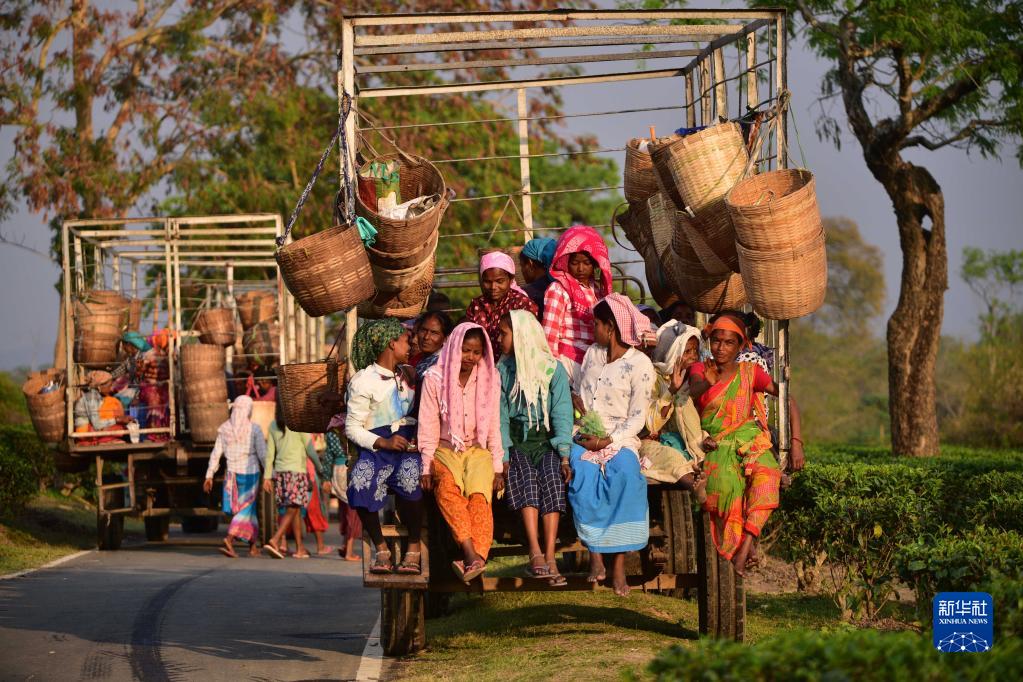 這是2023年3月14日,在印度阿薩姆邦納加奧恩地區,工人采茶后乘車離開。