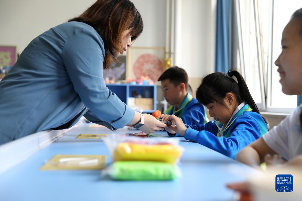 5月19日,莊巖帶著學生在美工教室內上手工美術課,她握著一名同學的手,讓其感受手工成品的樣子和細節。