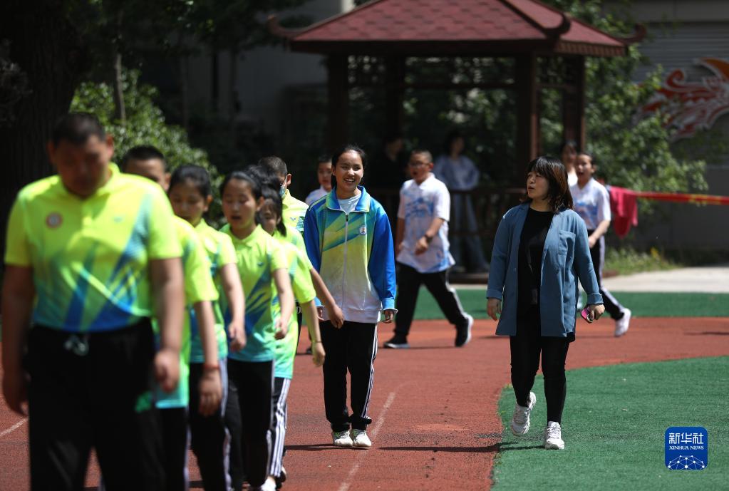 5月19日,課間操時間,莊巖帶著學生在操場上步行。