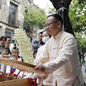 5月21日,在茶文化非遺項目展示交流活動上,工作人員引導小朋友體驗福州茉莉花茶窨制工藝。