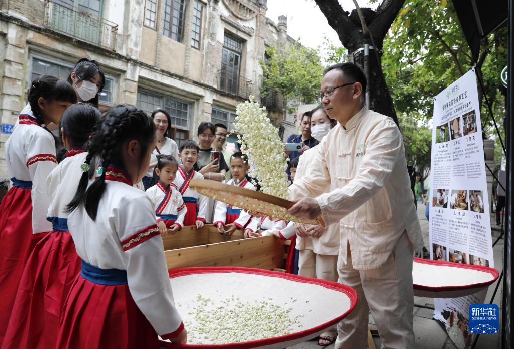 5月21日,在茶文化非遺項目展示交流活動上,工作人員展示福州茉莉花茶窨制工藝。
