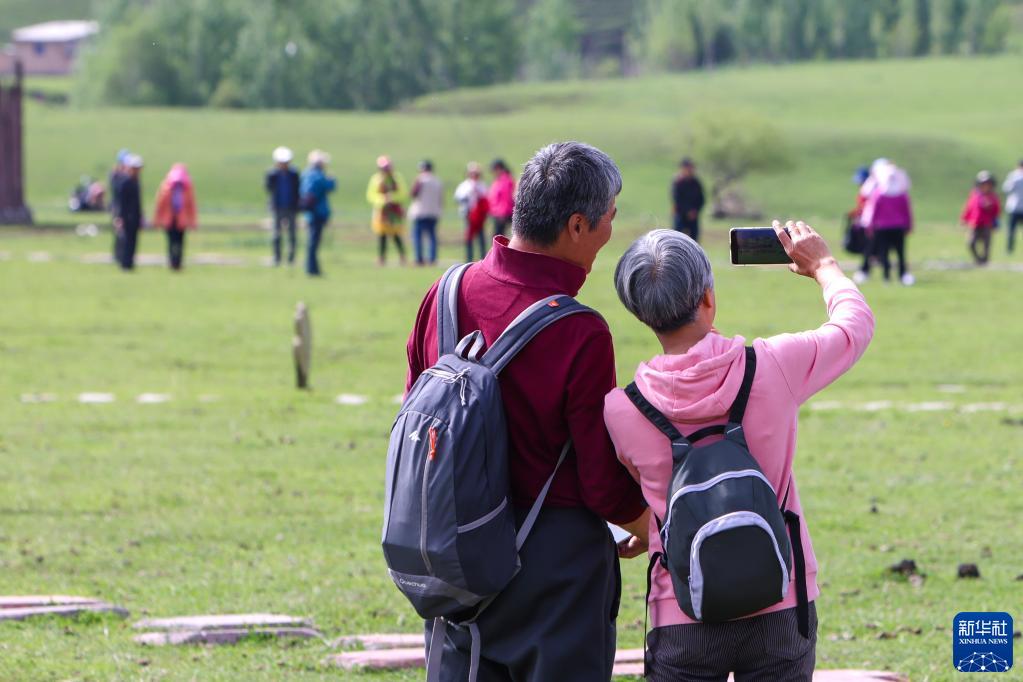 5月20日,游客在位于新疆新源縣的那拉提旅游風景區自拍留影。