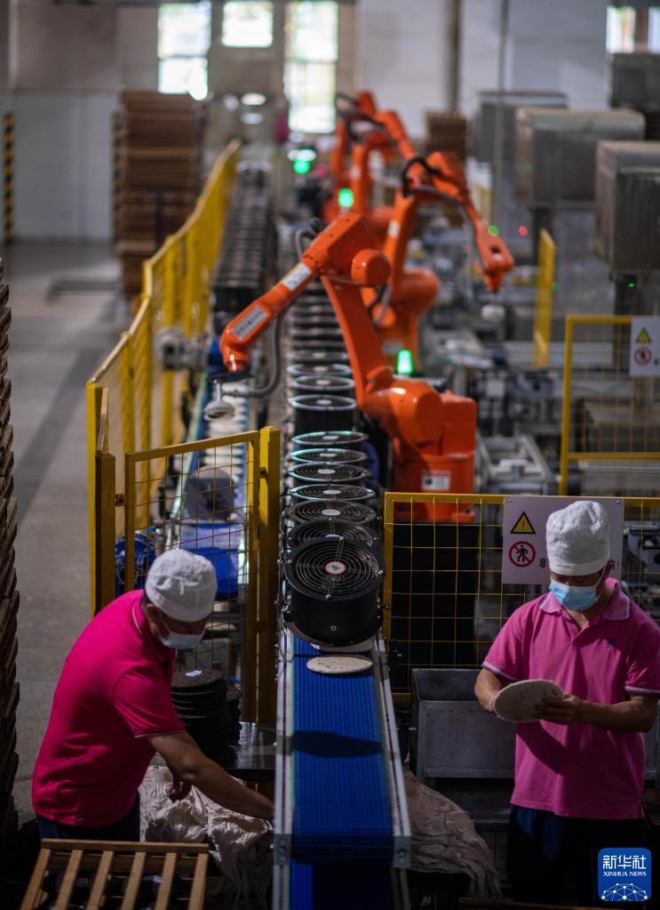 這是2023年5月18日,中國云南省勐??h勐海茶廠的工人在自動機械臂的協助下分揀包裝普洱茶餅。