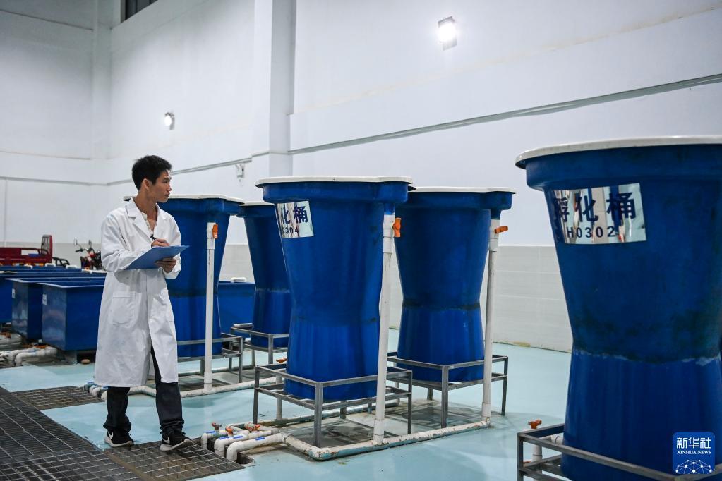 5月20日,技術人員在廣西大藤峽水利樞紐工程魚類增殖放流站查看魚苗孵化桶。