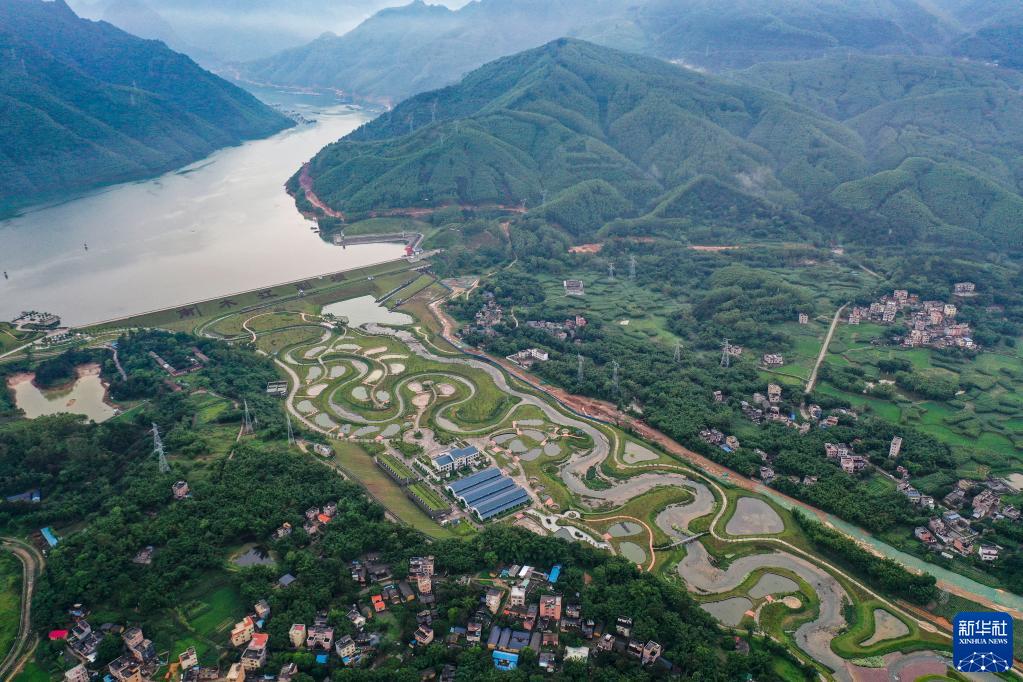 這是5月20日拍攝的廣西大藤峽水利樞紐工程南木江副壩仿自然生態魚道和上游峽谷(無人機照片)。