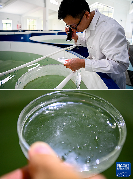 這是一張拼版照片,5月20日,科研人員在廣西大藤峽水利樞紐工程魚類增殖放流站觀察魚苗的生長情況。