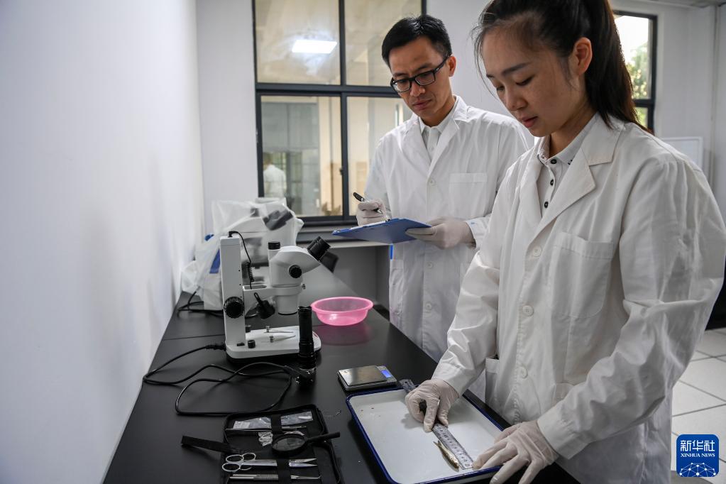 5月20日,科研人員在廣西大藤峽水利樞紐工程珍稀魚類保育中心的實驗室內收集野生魚的生物數據。