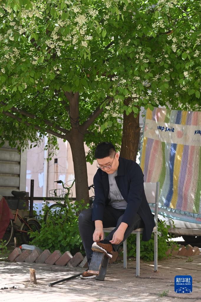 趙強在陽光家園門前的小區樹下整理鞋帶(4月18日攝)。