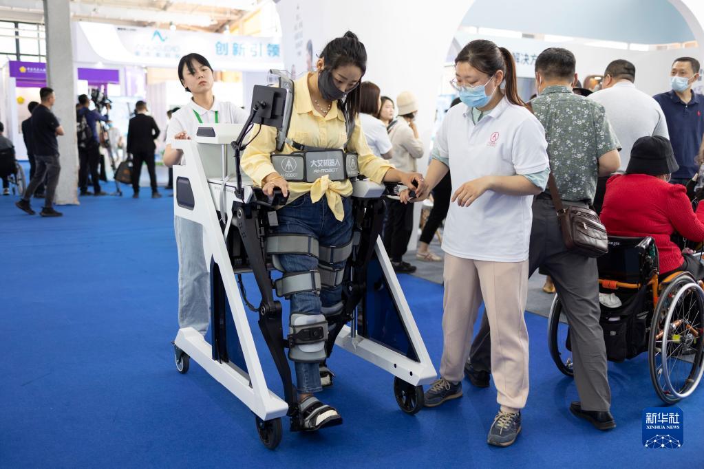 5月21日,在2023中國國際福祉博覽會上,一名參觀者試用名下肢外骨骼機器人。這款機器人以主被動訓練結合的方式為下肢肢殘患者進行康復運動訓練。