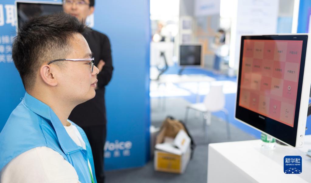 5月21日,在2023中國國際福祉博覽會上,一名工作人員演示“mind voice”心語眼動系統。該系統可讓殘障人士通過注視屏幕并轉動眼球實現與他人溝通需求、輸入文字等。