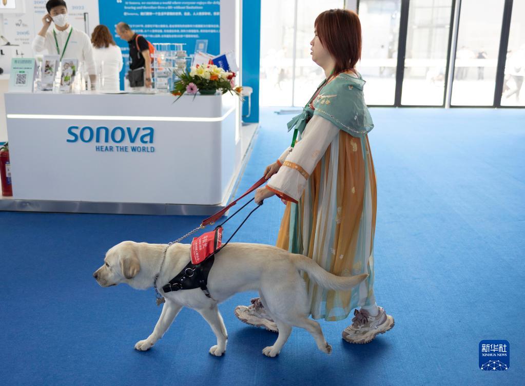 5月21日,在2023中國國際福祉博覽會上,一名視障女孩演示導盲犬如何帶領她走路。
