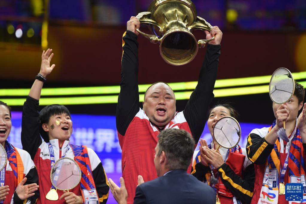 5月21日,中國羽毛球協會主席張軍(中)在頒獎儀式上舉起蘇迪曼杯。