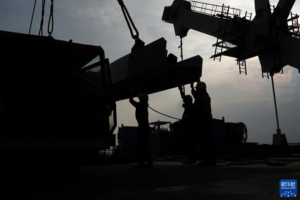 5月21日,在中鐵大橋局常泰長江大橋錄安洲專用航道橋施工現場,工人在卸鋼梁桿件。