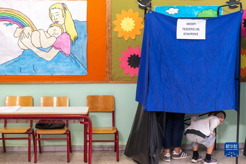 5月21日,一名選民帶著孩子在希臘雅典一處投票站參加投票。
