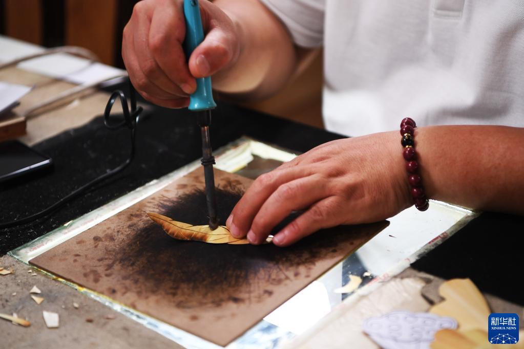 5月16日,葛磊在非遺傳習基地制作蘆葦畫時進行烙燙。