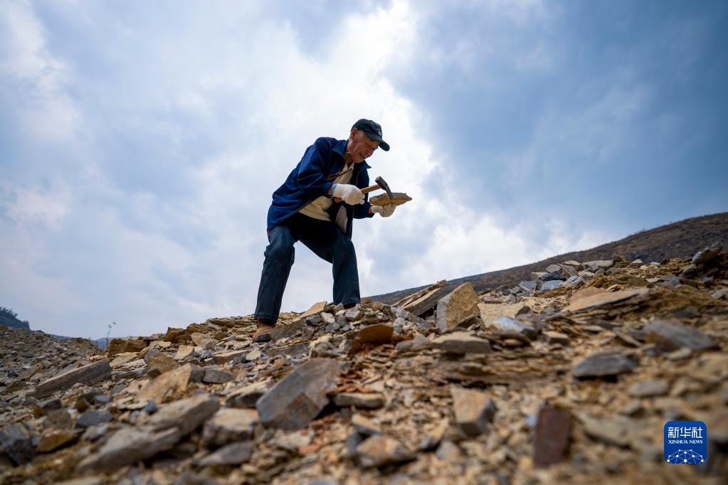 張世山在昆陽磷礦礦坑里搜尋化石(5月10日攝)。