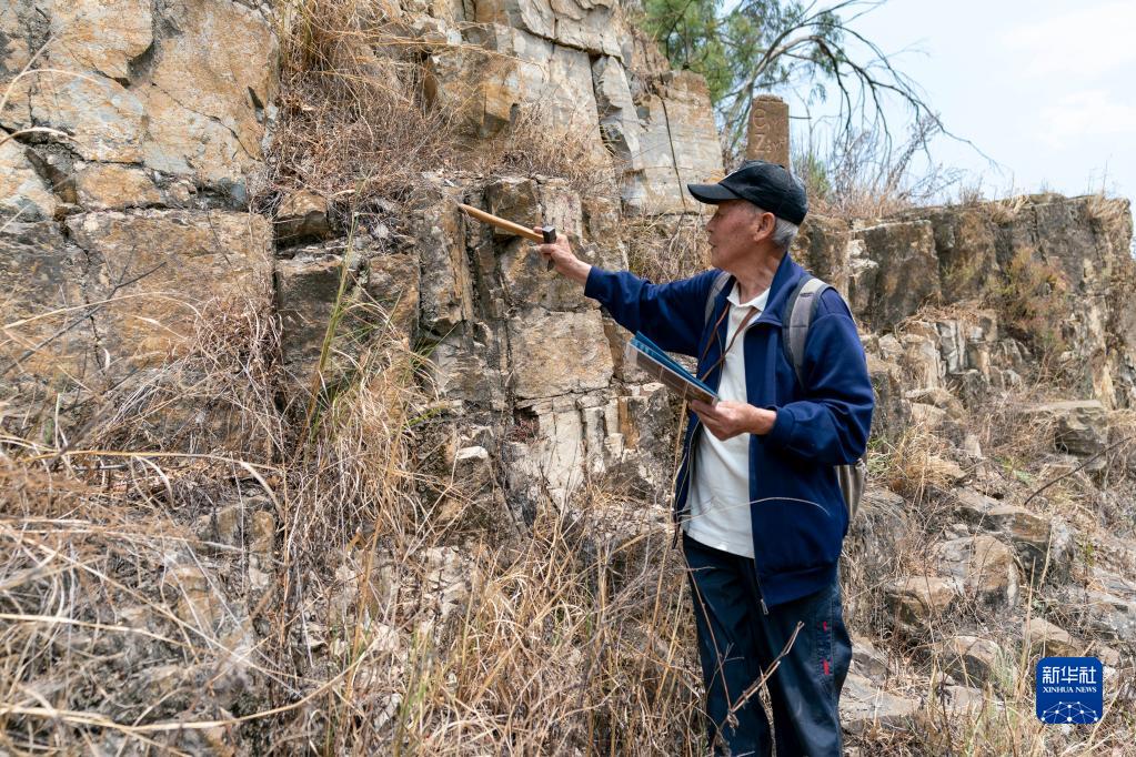 張世山在梅樹村剖面一處巖石斷層前查看巖石(5月10日攝)。