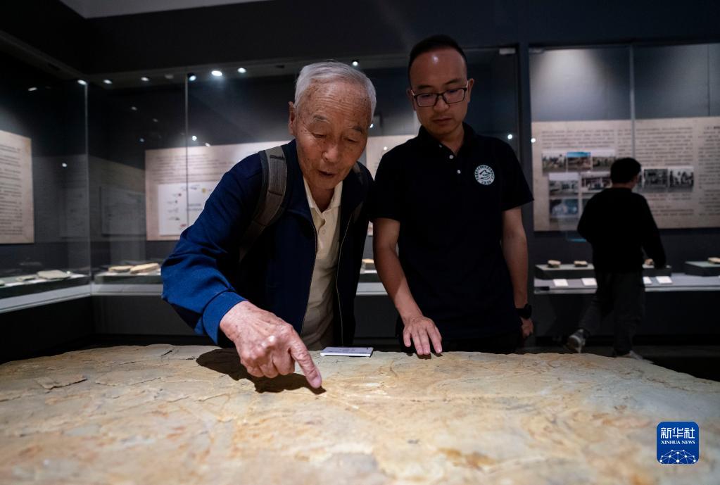 張世山在昆明晉寧博物館內講述一塊遺跡化石的發現經過(5月10日攝)。