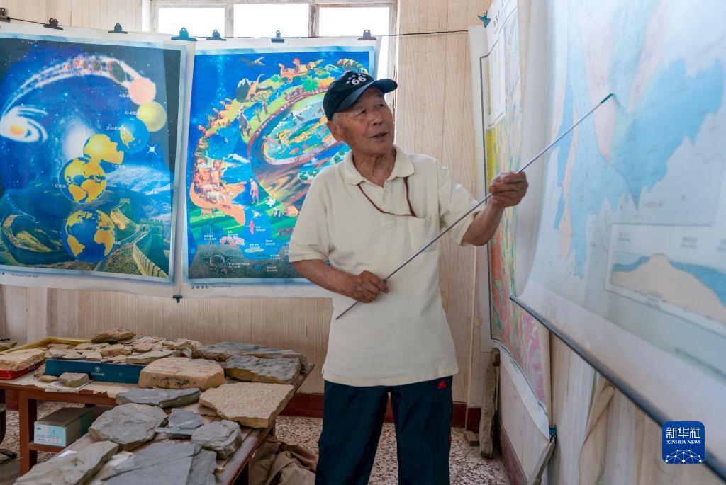 張世山在收藏化石的標本館內講解古生物化石知識(5月10日攝)。