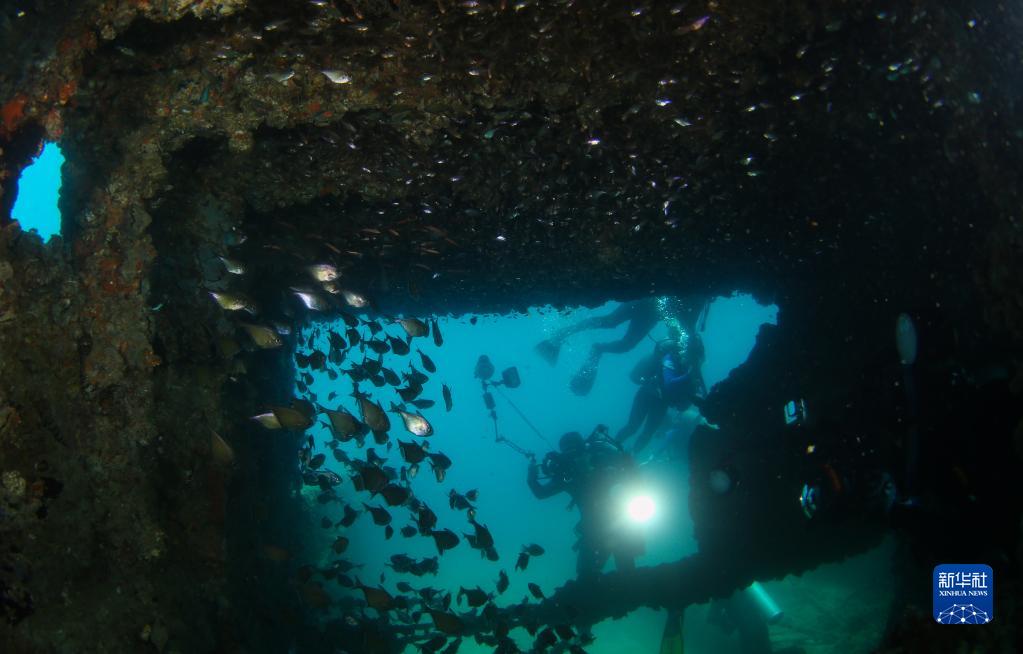 攝影愛好者在蜈支洲島海域海洋牧場拍攝沉船魚礁內的魚群(2021年5月21日攝)。