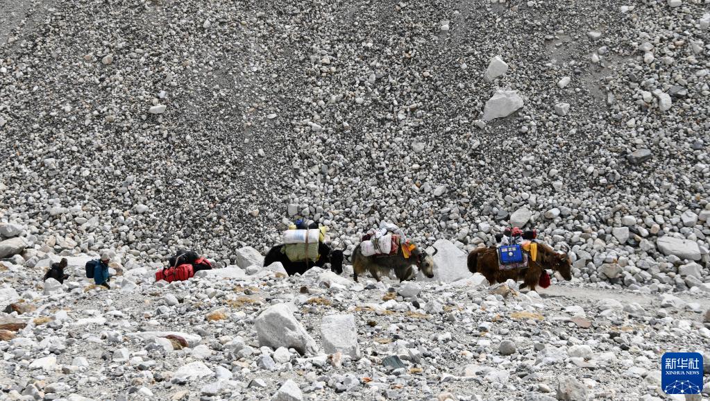 牦牛運輸隊向海拔6500米的珠峰前進營地進發(5月12日攝)。