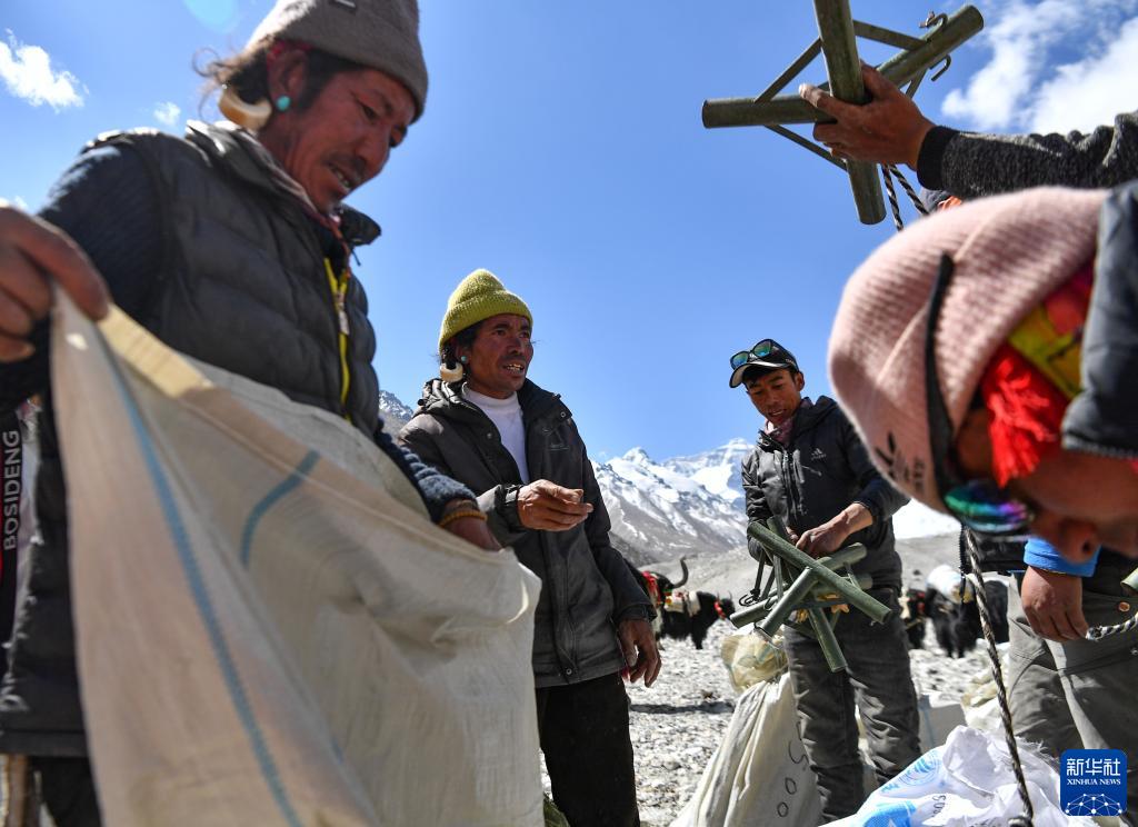 在珠峰登山大本營,牦牛工打包待馱運的物資(5月18日攝)。