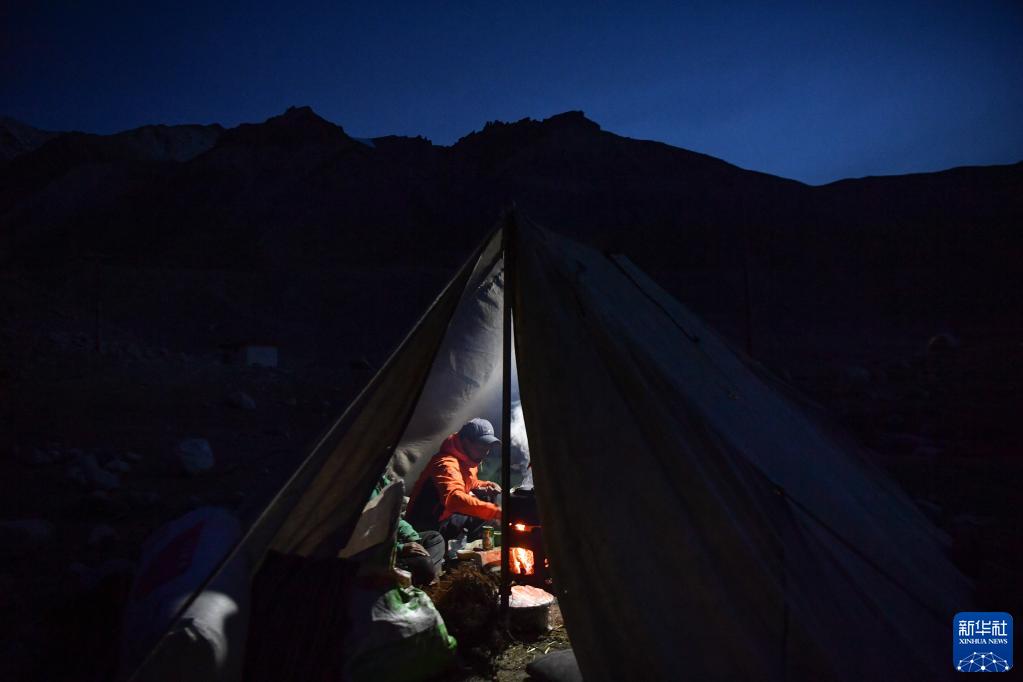 在珠峰登山大本營附近搭建的帳篷里,牦牛工班丹燒水煮茶(5月17日攝)。