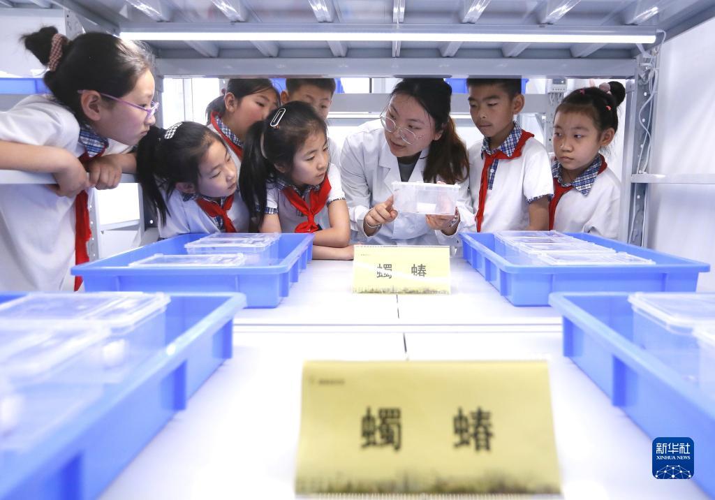 5月22日,在中國農業科學院青島特種作物研究中心試驗基地,工作人員為小學生講解農作物害蟲綠色防控技術。