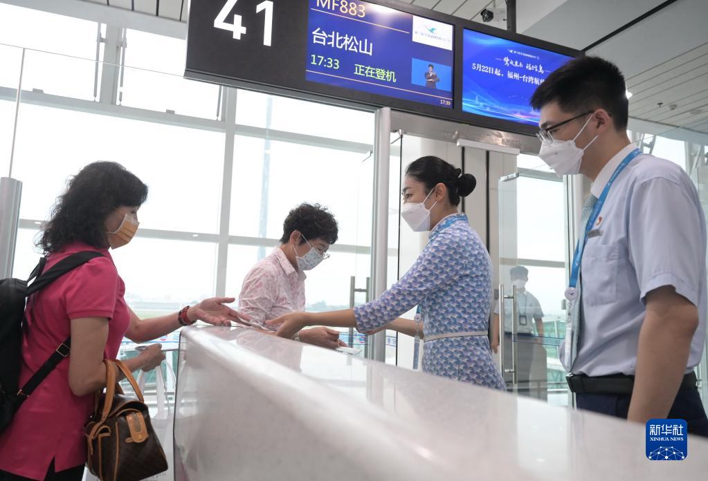 5月22日,旅客在福州長樂國際機場辦理飛往臺北松山機場的MF883航班登機手續。
