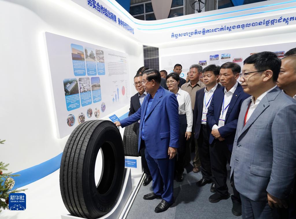 5月22日,柬埔寨首相洪森(前左)在西哈努克港經濟特區參觀共建“一帶一路”倡議十周年西港特區成果展。新華社發(李萊 攝)