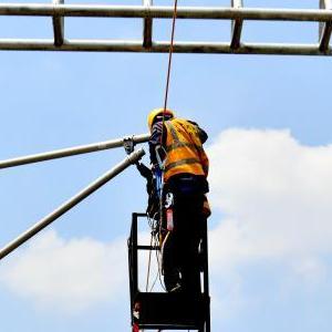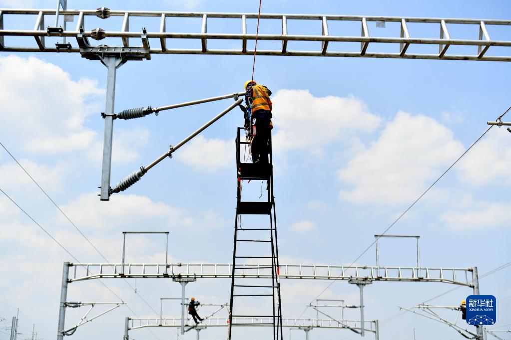 5月23日,在成宜高鐵宜賓站,施工人員在架設接觸網。