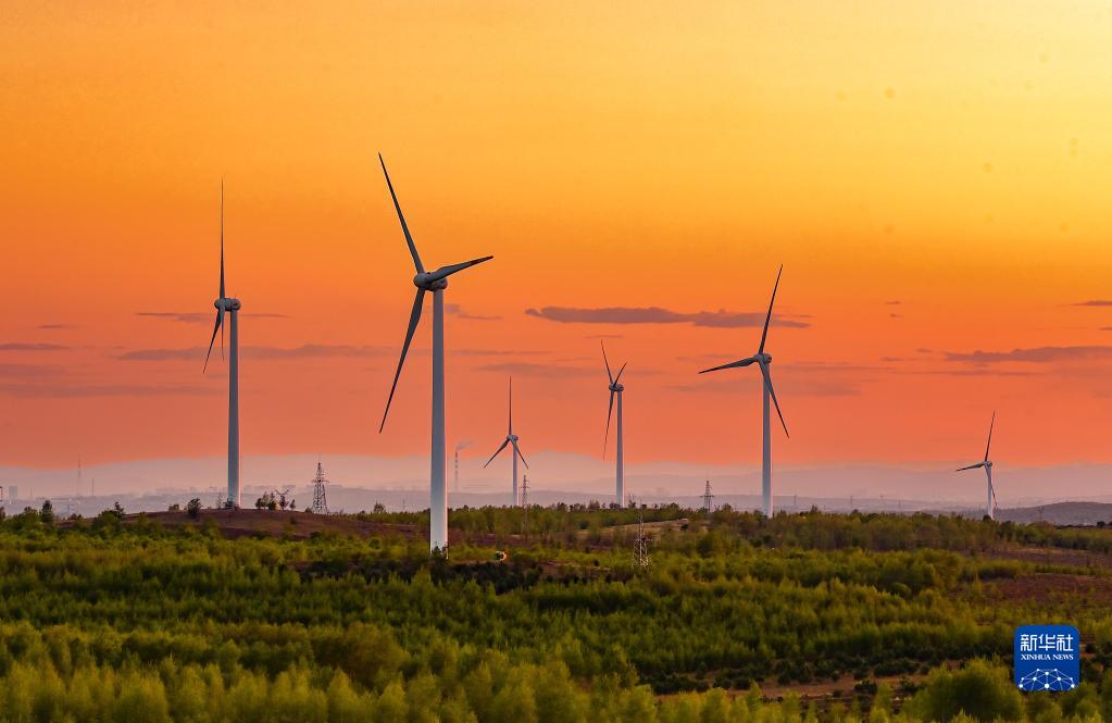 5月23日清晨拍攝的興安盟烏蘭浩特市呼和馬場風力光伏發電場內的風機。
