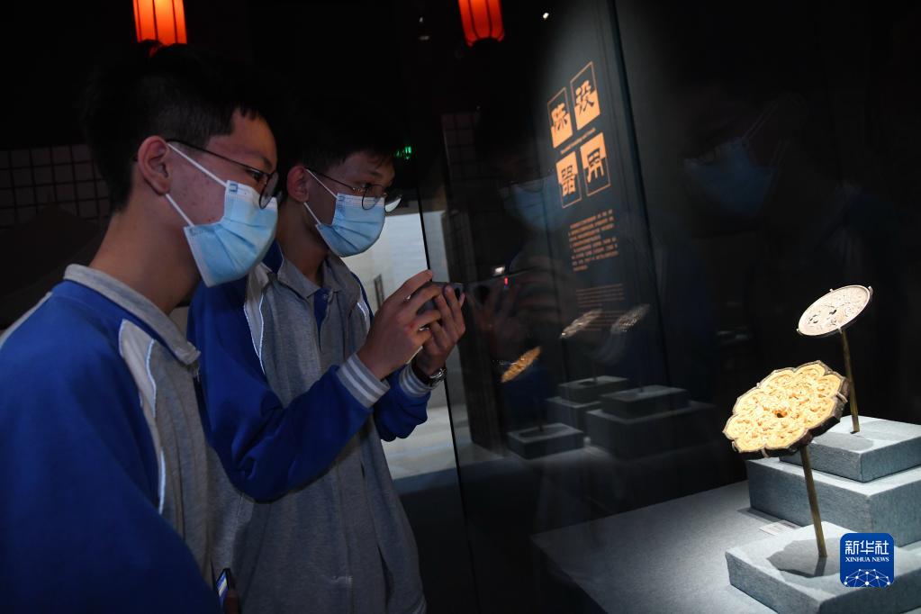 5月22日晚,游客在西安博物院《長安有故里——絲路少年大唐行》展覽上參觀。