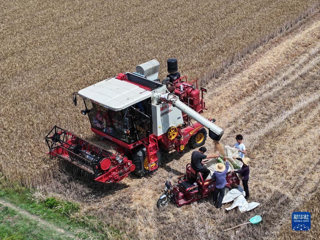 近日,河南省小麥主產區南陽市小麥進入成熟期,當地農業部門搶抓農時,組織收割機開展夏收作業,收割小麥。