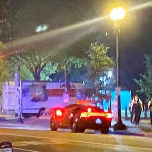 這是5月22日在美國華盛頓白宮附近拍攝的卡車沖撞安全護欄事故現場。