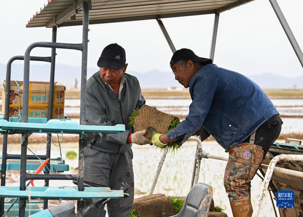 5月23日,達拉特旗昭君鎮村民在為農機添加秧苗。