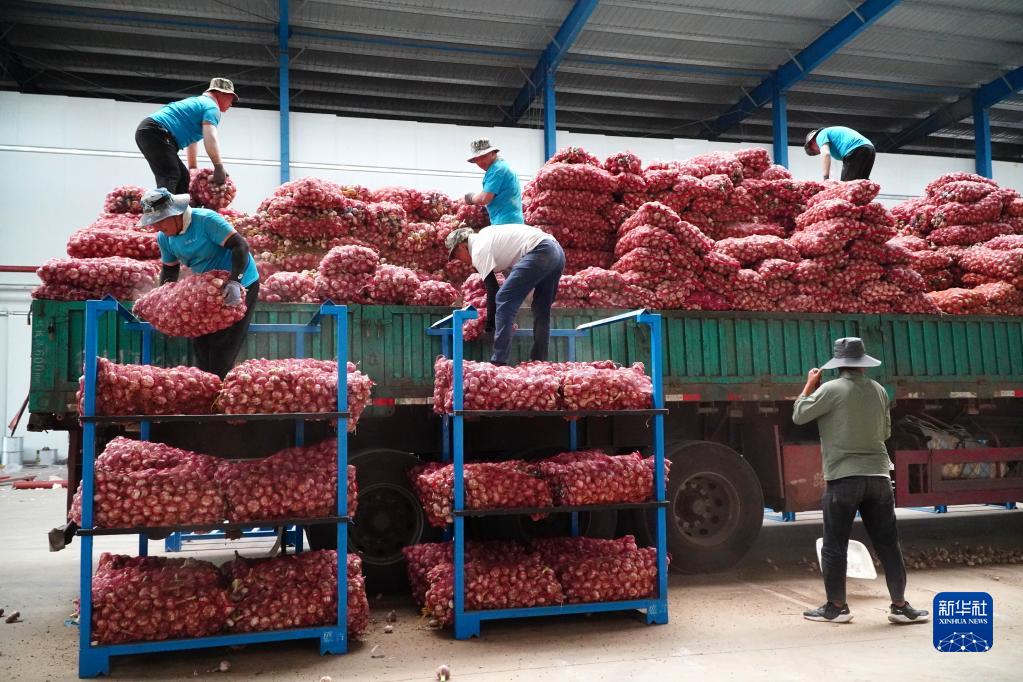 5月23日,在山東省巨野縣陶廟鎮一家經營大蒜倉儲業務的公司,工作人員在搬運剛收購的大蒜。