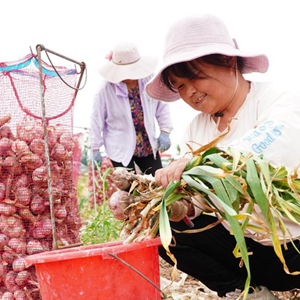 近日,山東省巨野縣農戶種植的大蒜進入收獲期。近年來,巨野縣建立高標準大蒜種植基地35萬畝,建設大蒜倉儲冷庫500余座,大蒜已成為助力當地農民致富的主要特色產業。