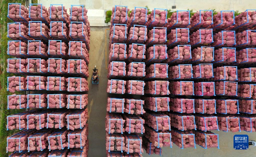近日,山東省巨野縣農戶種植的大蒜進入收獲期。近年來,巨野縣建立高標準大蒜種植基地35萬畝,建設大蒜倉儲冷庫500余座,大蒜已成為助力當地農民致富的主要特色產業。