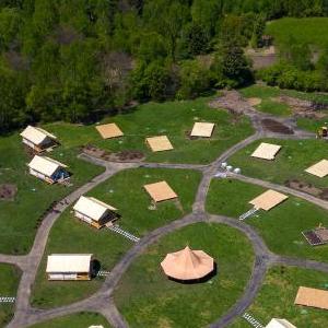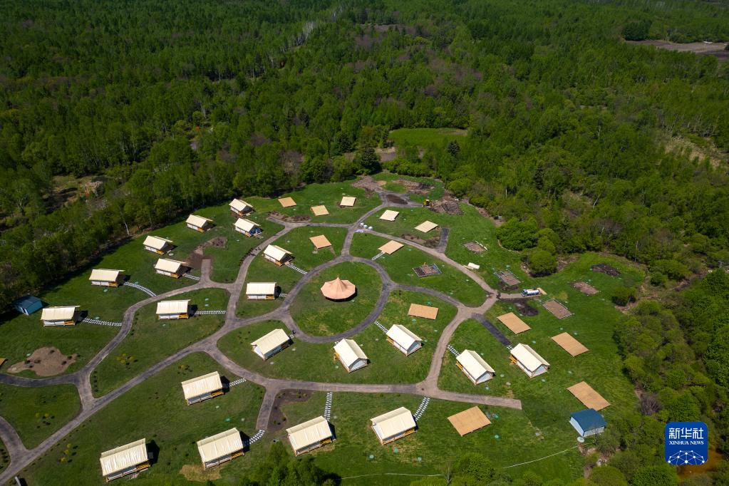 這是5月24日拍攝的伊春森工集團上甘嶺林業局公司溪水林場在建的溪水野奢帳篷度假酒店項目(無人機照片)。