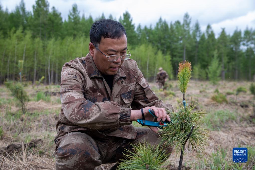 5月21日,在伊春森工集團紅星林業局公司五星河林場分公司紅松兼果林基地,工作人員在養護紅松嫁接苗。