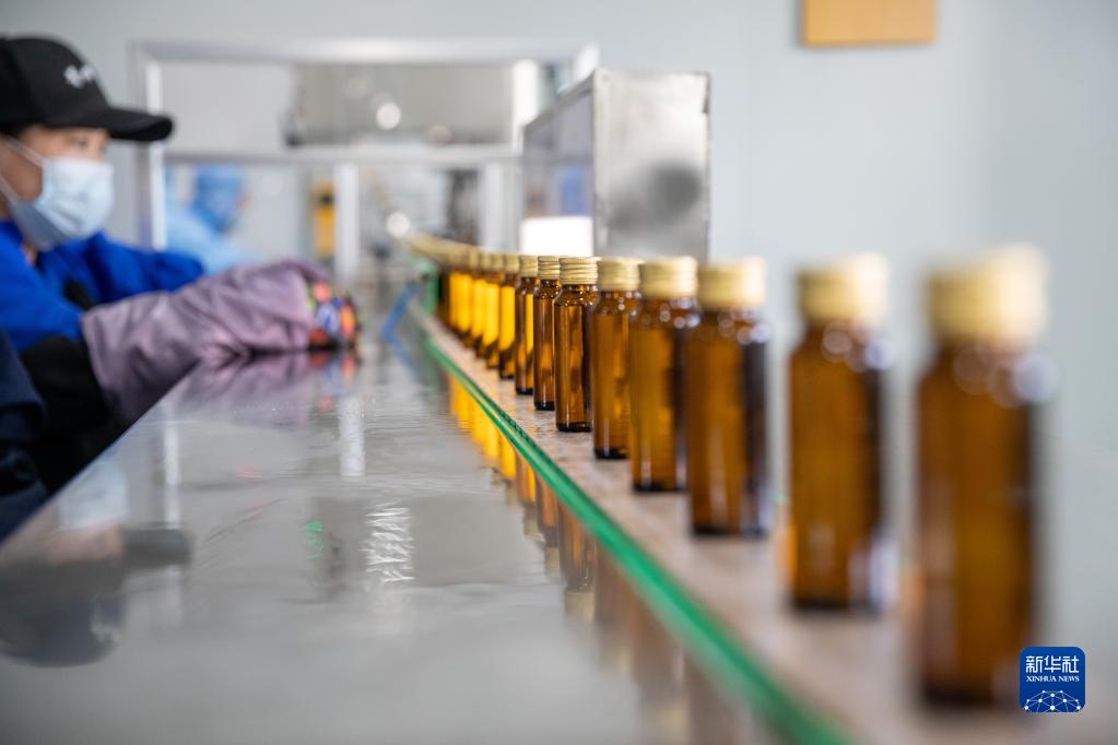 5月24日,在伊春菁樺生物科技有限公司生產車間內,工人在進行樺樹汁飲品灌裝作業。