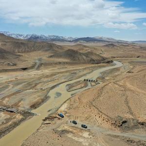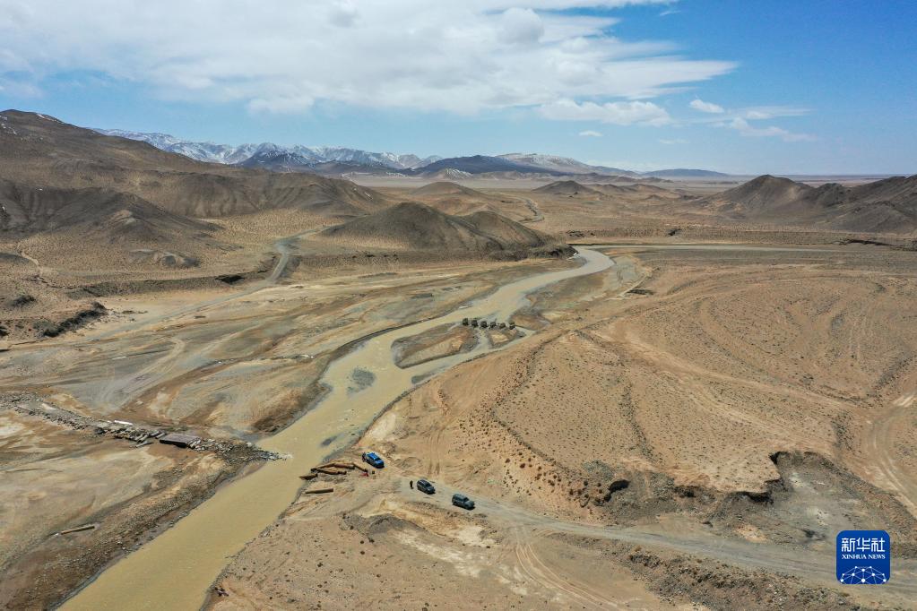 科考隊員在新疆東昆侖庫木庫里盆地古爾嘎赫德河進行水文巡測工作(5月22日攝,無人機照片)。