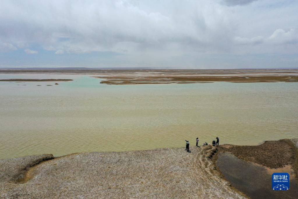 科考隊員在新疆東昆侖庫木庫里盆地阿雅克庫木湖河流入湖口進行水文巡測工作(5月23日攝,無人機照片)。