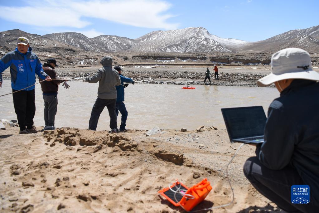 科考隊員在新疆東昆侖庫木庫里盆地通過多普勒測流船測量河流流速流量(5月22日攝)。