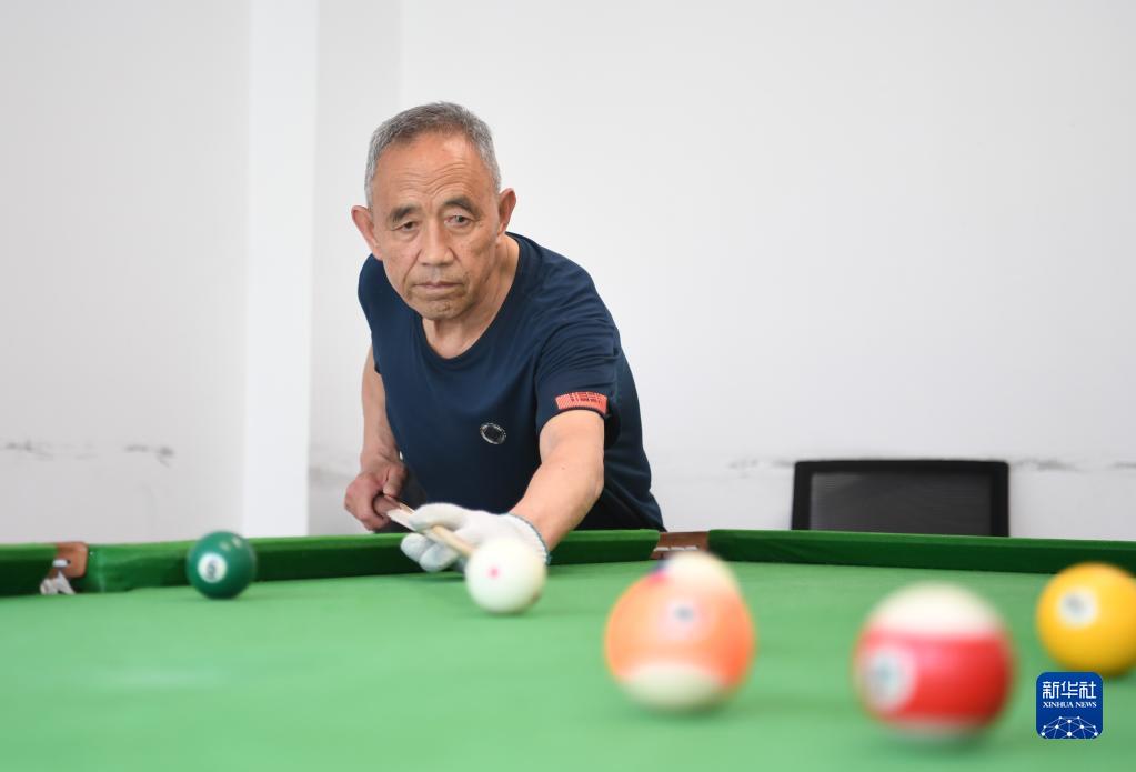 河北雄安新區容東片區南文營社區居民在社區養老驛站娛樂室打臺球(5月23日攝)。
